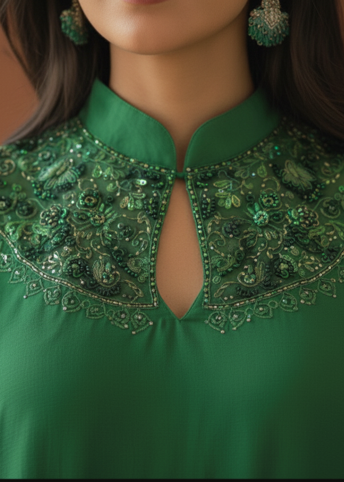 The flowing cape-style kurta with intricate hand embroidery on the neckline is paired with straight-cut trousers, creating a look that’s effortless yet striking. Perfect for cocktail evenings, festive galas, or modern wedding celebrations, this ensemble strikes the perfect balance between minimalism and grandeur.