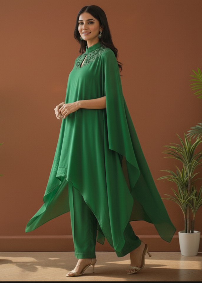 Drape yourself in modern royalty with Zehra, a statement-making emerald green cape kurta set that exudes contemporary elegance.