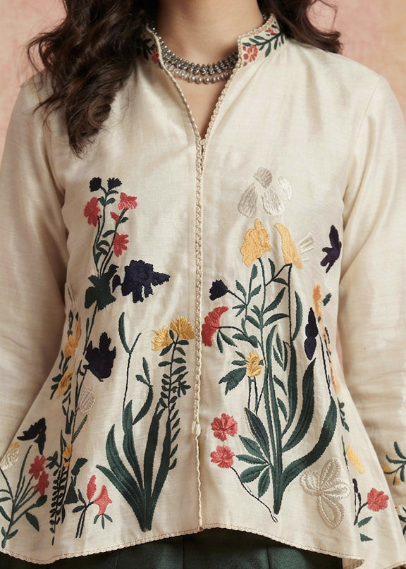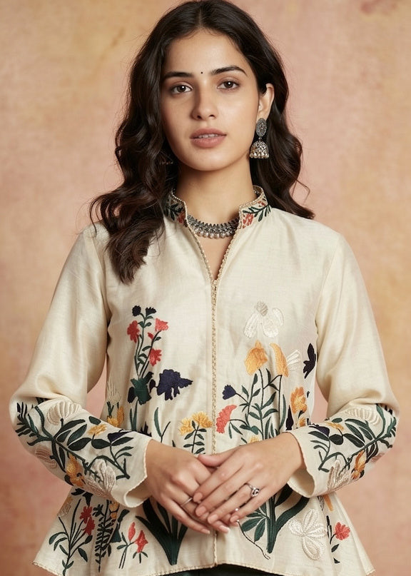 Samaira is a poetic blend of heritage craft and modern structure. The centerpiece is a structured cream Chanderi silk peplum shirt, featuring a chic high collar, front zip closure, and exquisite multi-coloured botanical thread embroidery inspired by vintage flora.