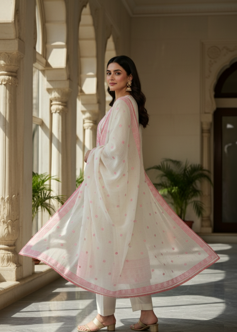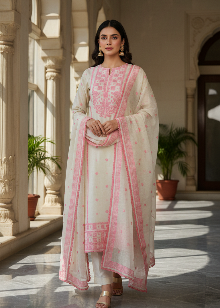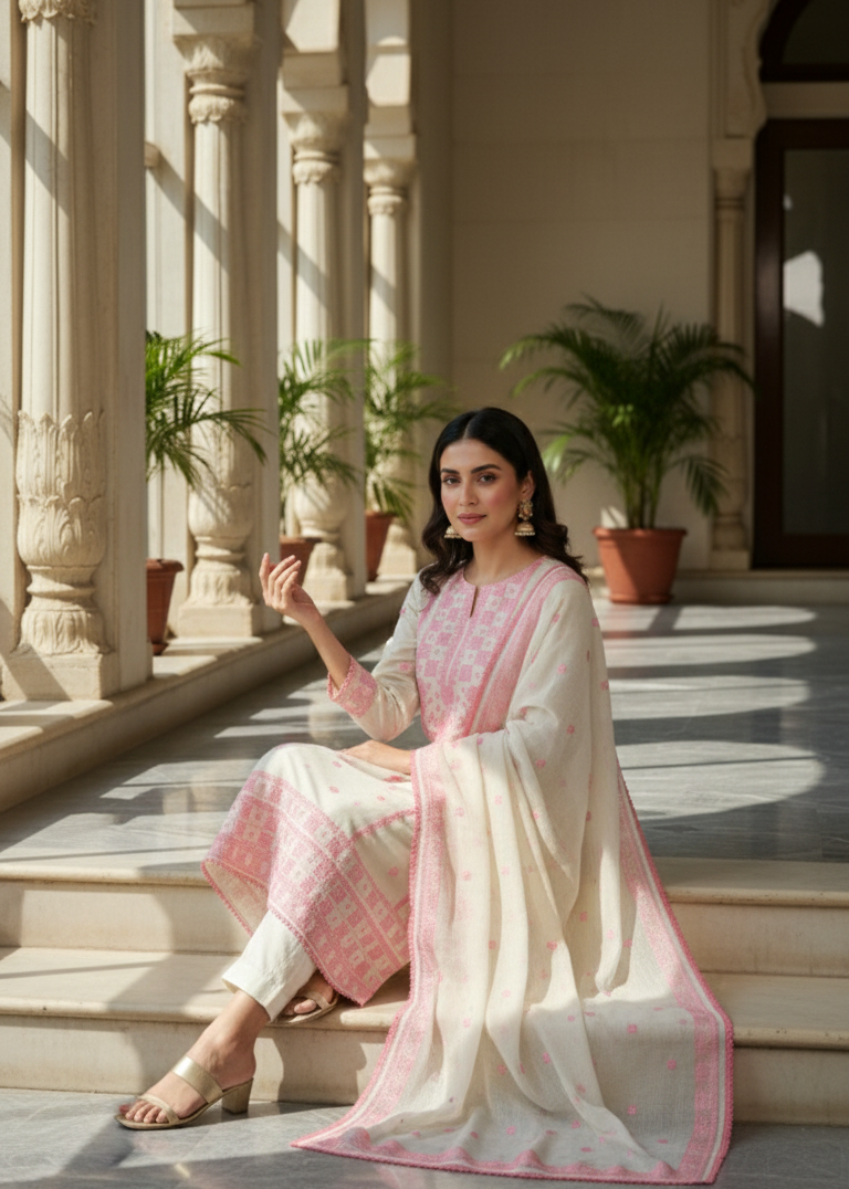 Tarannum: Ivory & Pink Embroidered Kurta Set with Geometric Dupatta