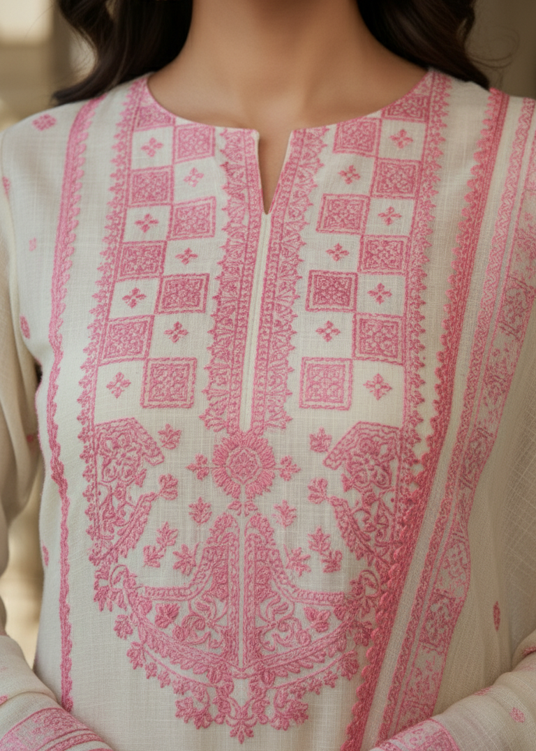 Tarannum blends the finest of ivory hues with soft pink geometric embroidery, creating a look that’s luminous and melodic under sunlit arches . Its fluid silhouette and gentle motifs bring together tradition and modern ease, making this kurta set perfect for elegant celebrations, day occasions, and timeless style