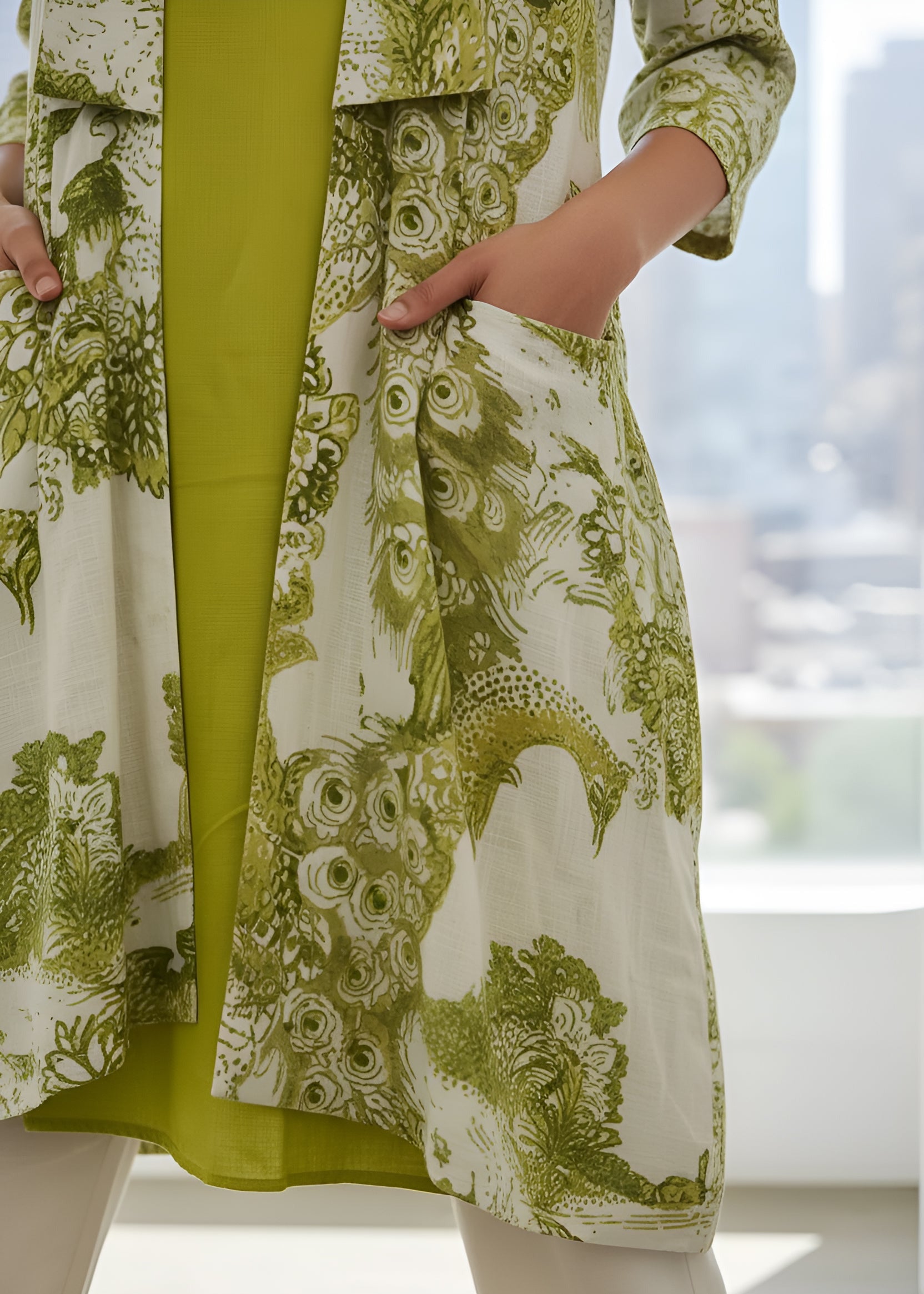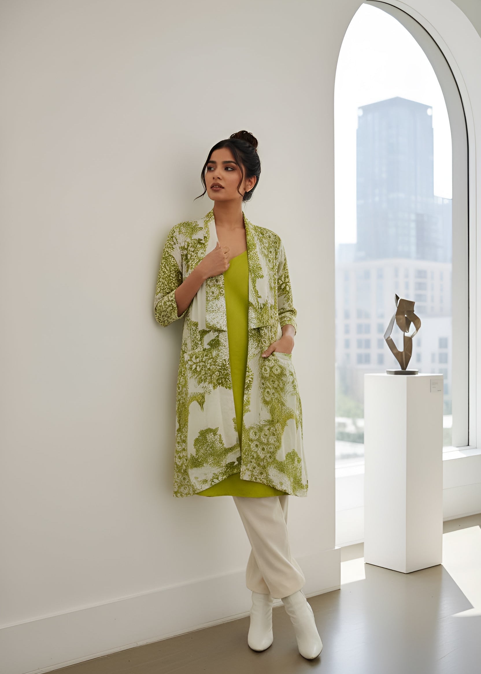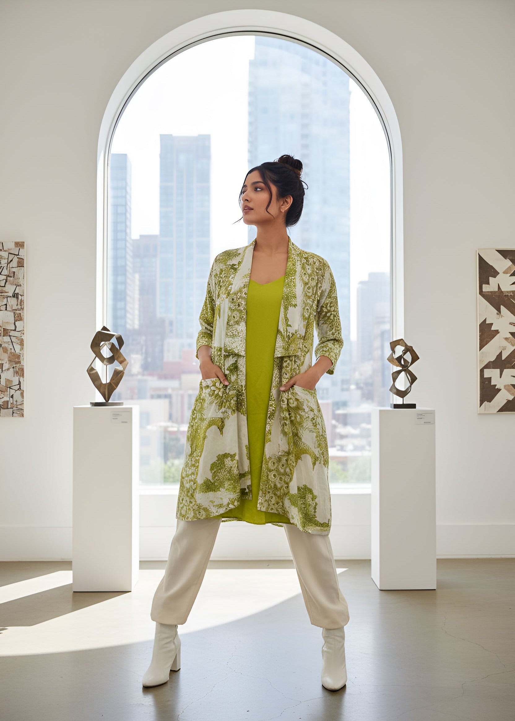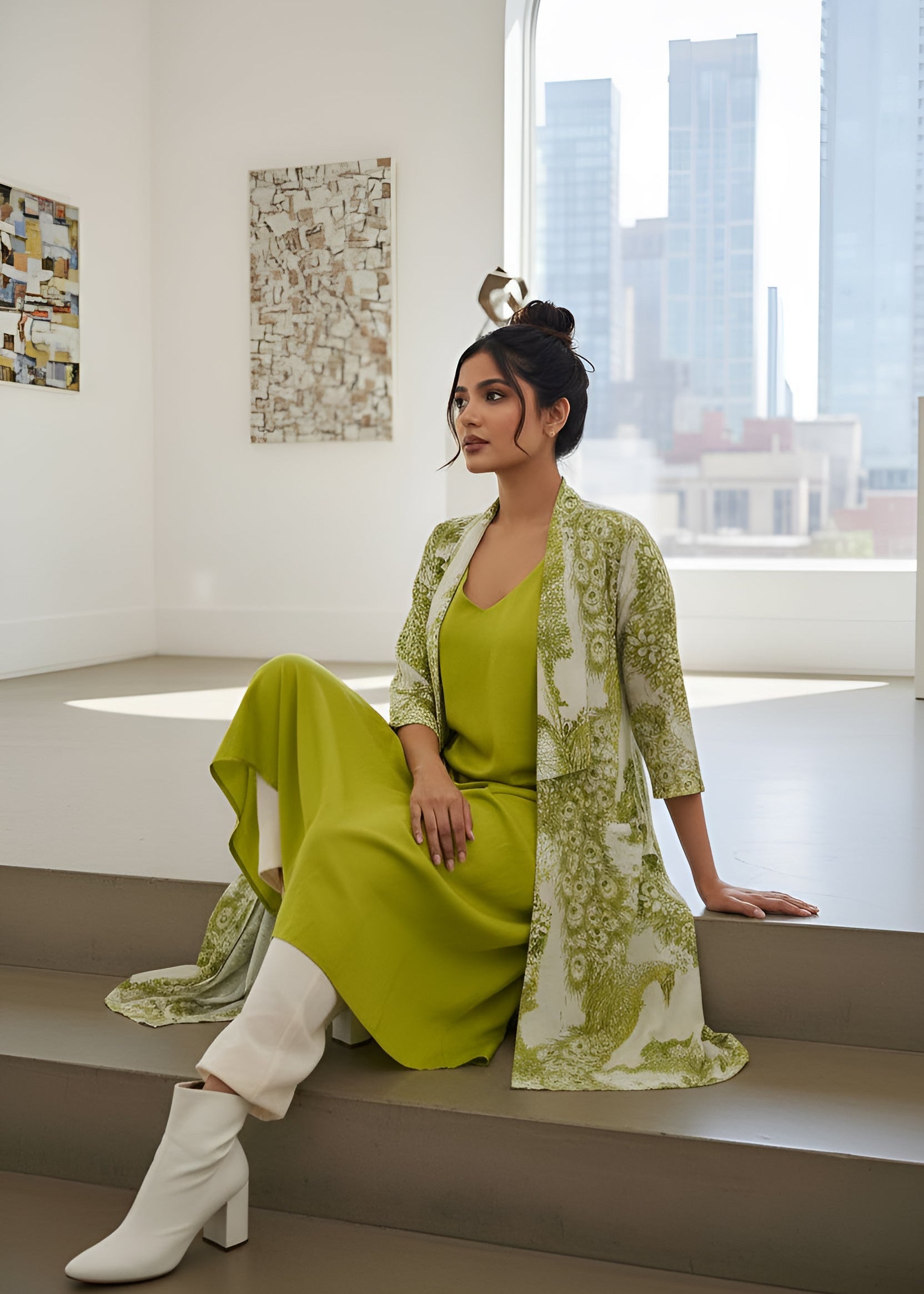 Mayur captivates with its artful peacock-print kimono jacket, paired with a luminous chartreuse slip and tailored ivory cigarette pants for a relaxed yet opulent city edit . Designed for travel, gallery events, and day-to-night urban style, this set delivers the best of Indian artistry—mixing bold motifs, fusion layers, and clean, modern lines.