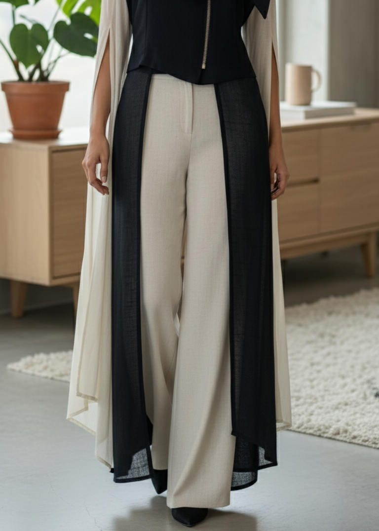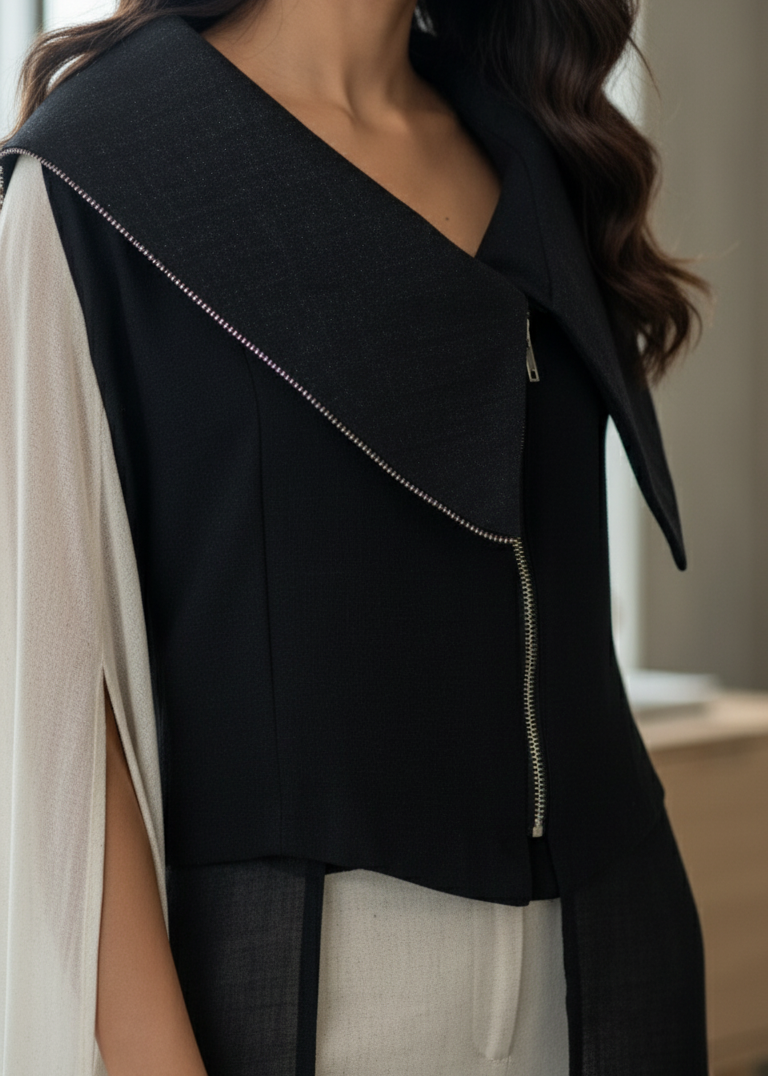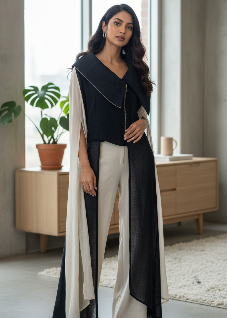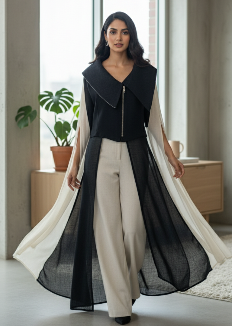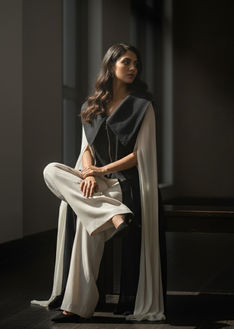Saaya merges modern silhouettes with flowing monochrome contrasts in a cape-style fusion set, ideal for bold occasions and creative gatherings . Its graceful lines and sartorial shadow-play makes every movement memorable, balancing structured elegance with fluidity in contemporary spaces