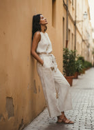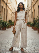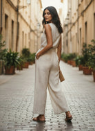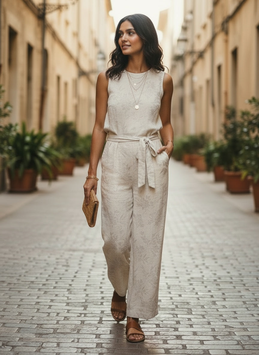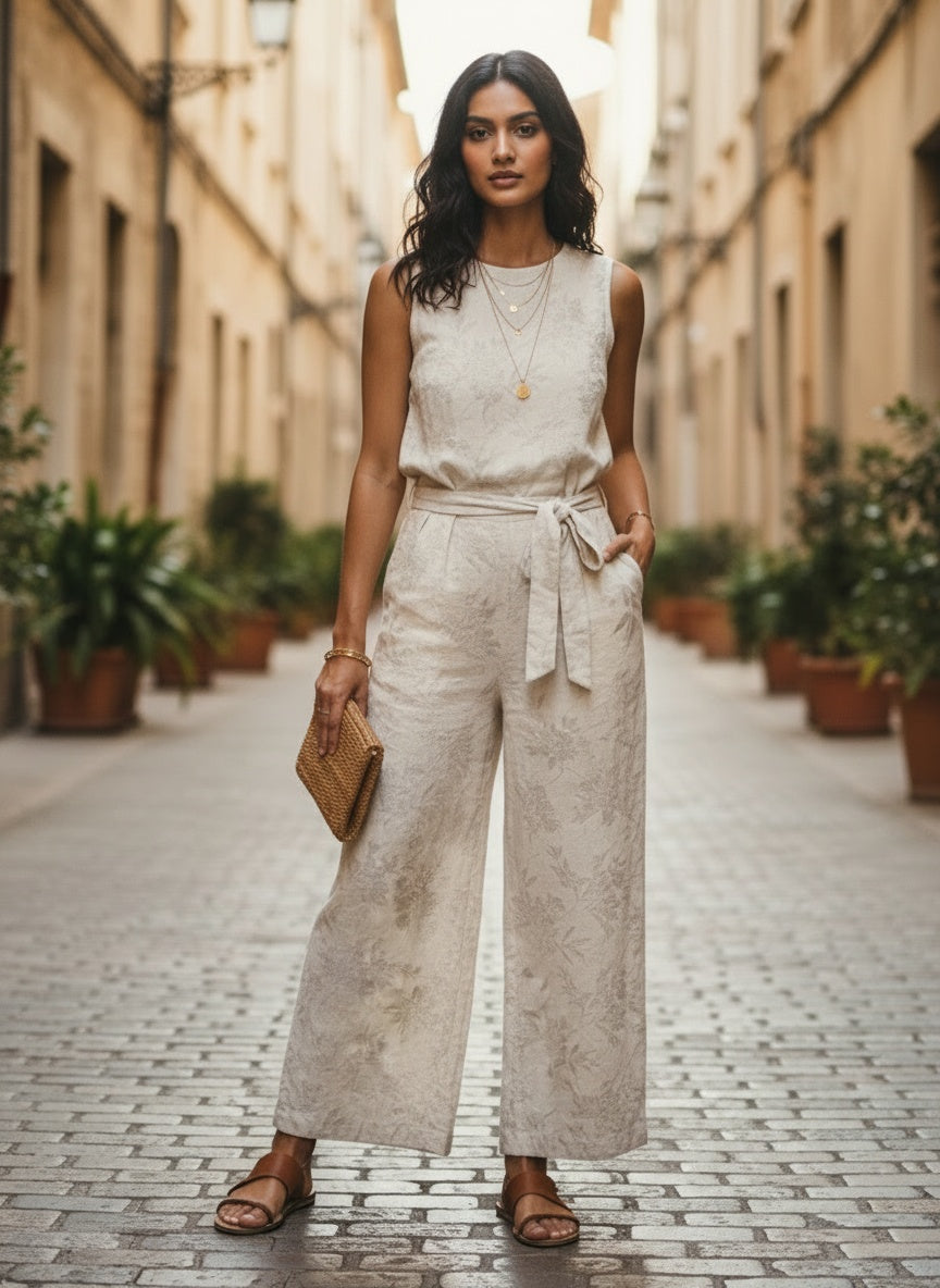 Noor is an effortlessly chic jumpsuit crafted in premium off-white linen jacquard, featuring a tonal woven floral pattern that adds quiet luxury to a minimalist staple. The sleeveless bodice and belted waist create a flattering, tailored fit, while the relaxed wide-leg trousers ensure all-day comfort. Perfect for summer brunches, resort evenings, or stylish city strolls.