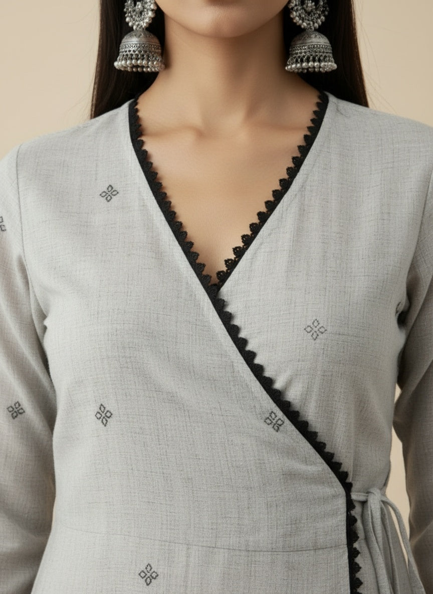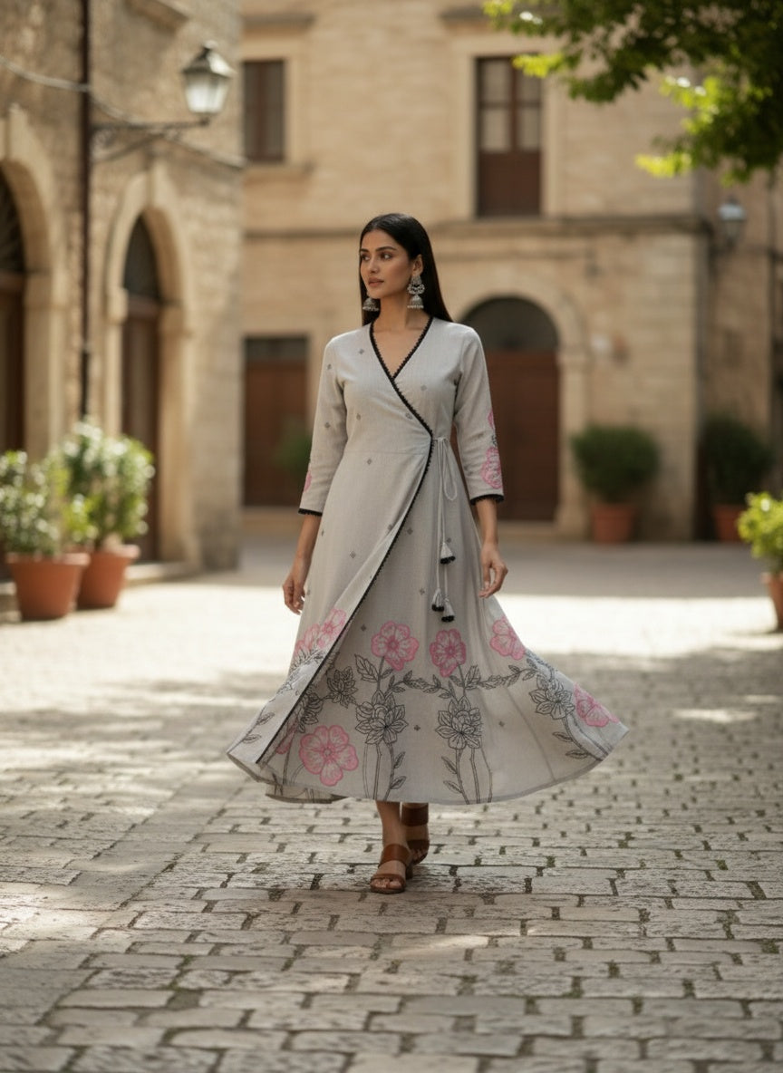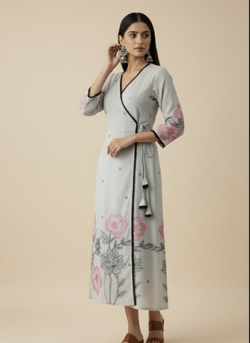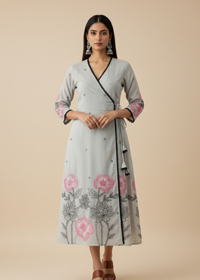 Gulzaar is a soft grey wrap midi dress featuring sketch‑style blush florals blooming along the hem and sleeves, finished with a slim black scalloped edging. The Angrakha-inspired silhouette ties neatly at the side with tasselled doris, creating a flattering V-neck and gentle A‑line flare—an easy choice for brunches, art gatherings, or intimate celebrations where modern minimalism meets feminine Indian craft.