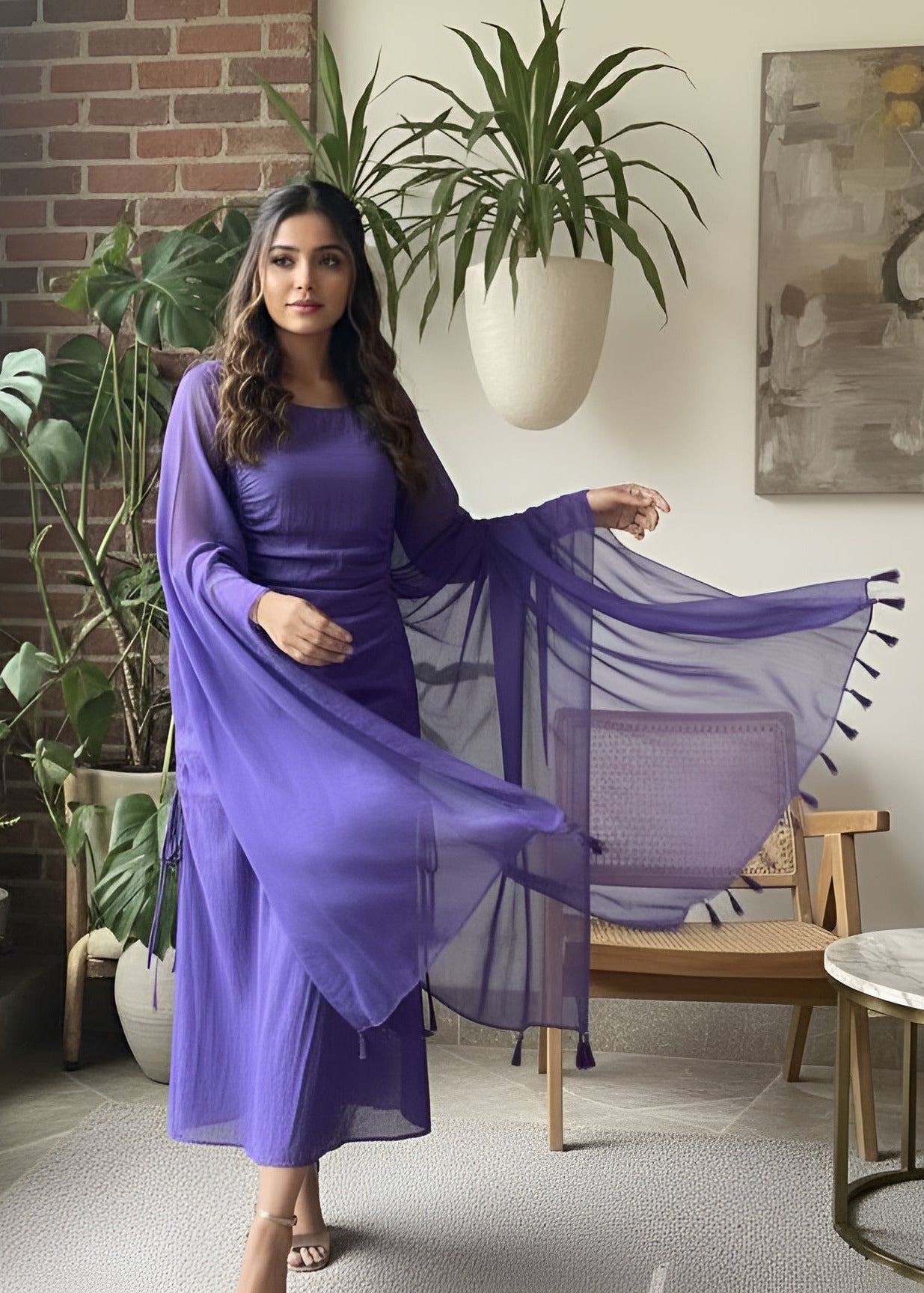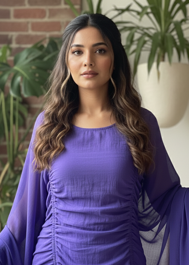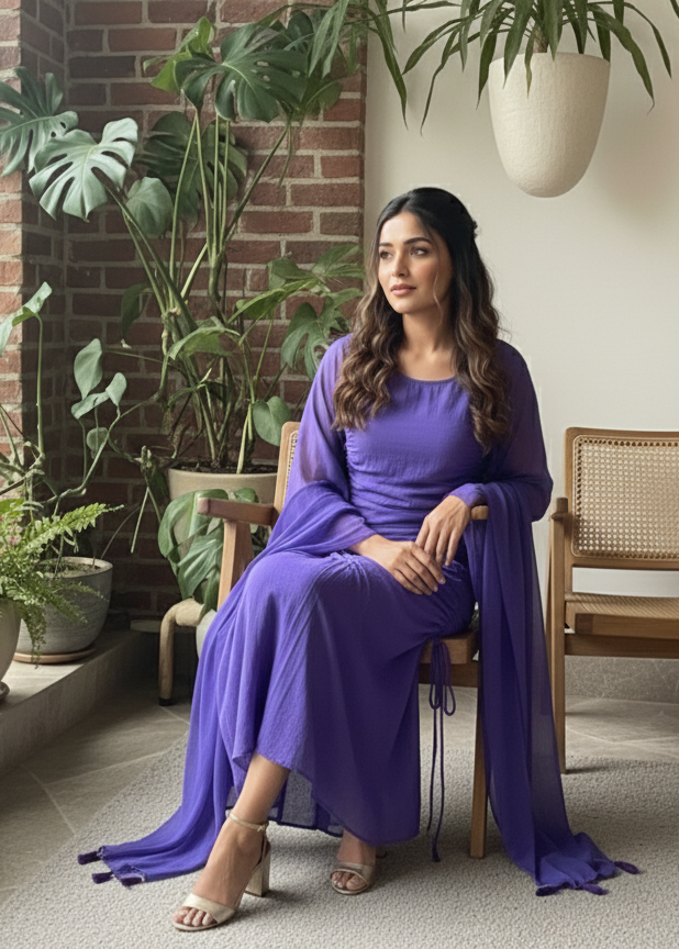 A refined occasion‑wear piece in a striking jamuni tone, crafted with graceful drape and a flattering, photo‑ready silhouette that moves beautifully indoors under soft natural light . The look balances modern elegance with effortless comfort, pairing fluid layers and thoughtful construction that transitions from cocktail evenings to festive gatherings with ease . Style with strappy heels and minimal jewelry to let the color and flow take center stage.