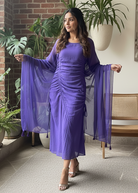Jamuni Aabha: Draped Midi Dress with Sheer Cape Sleeves