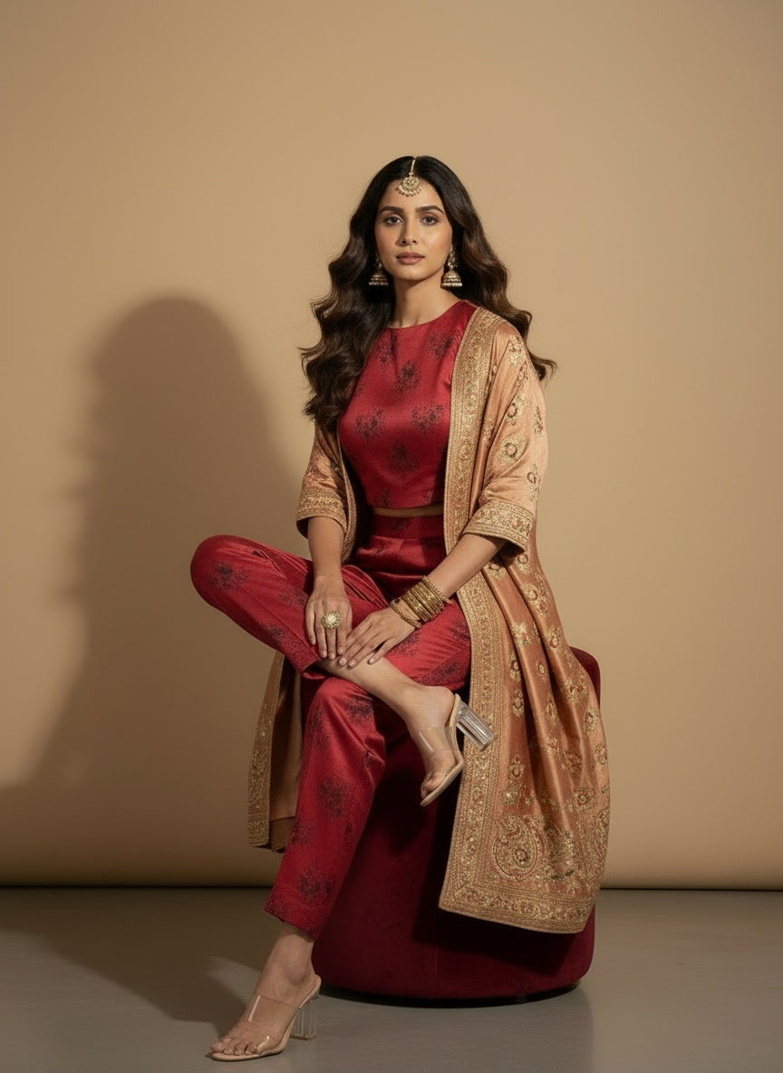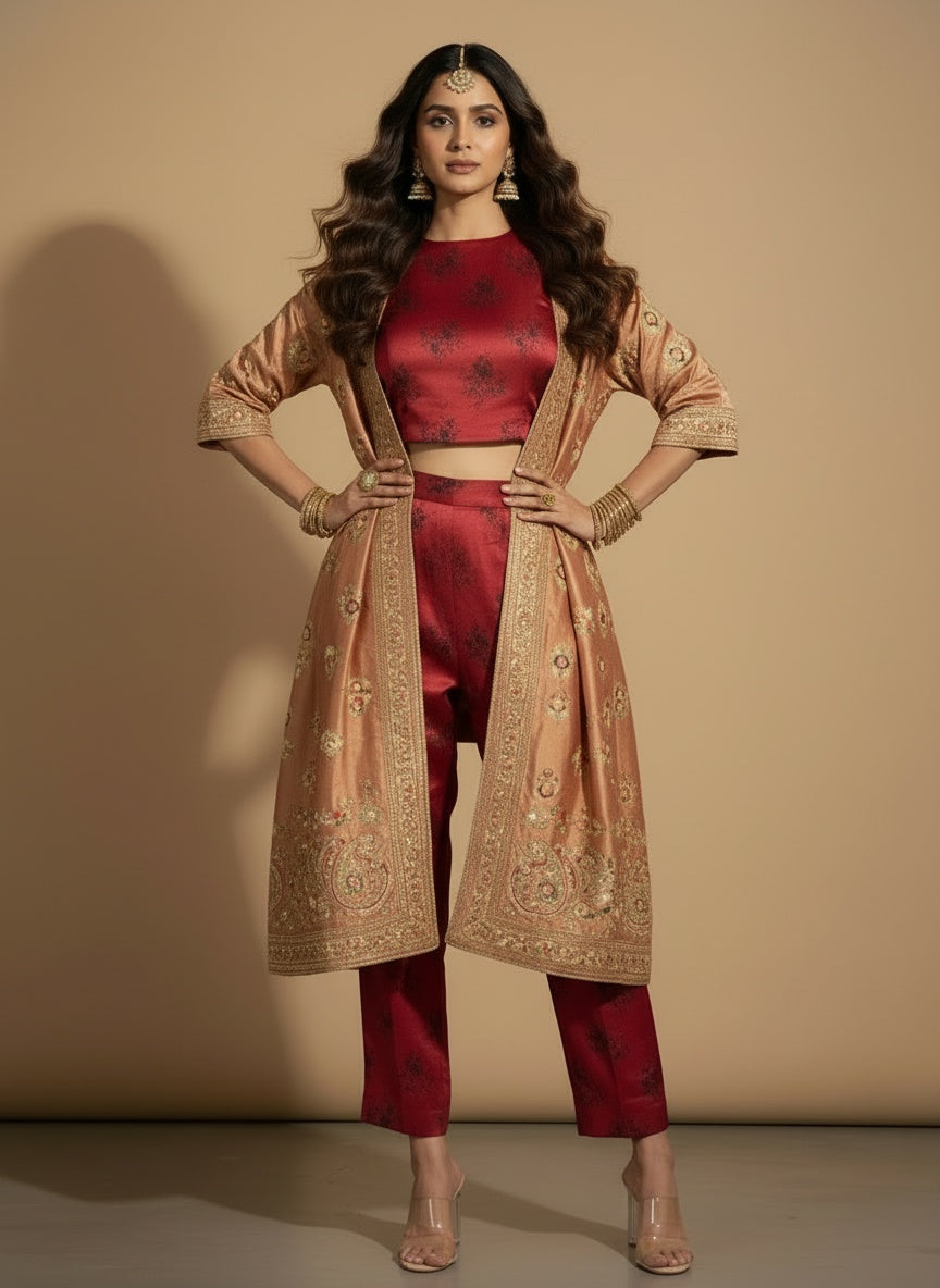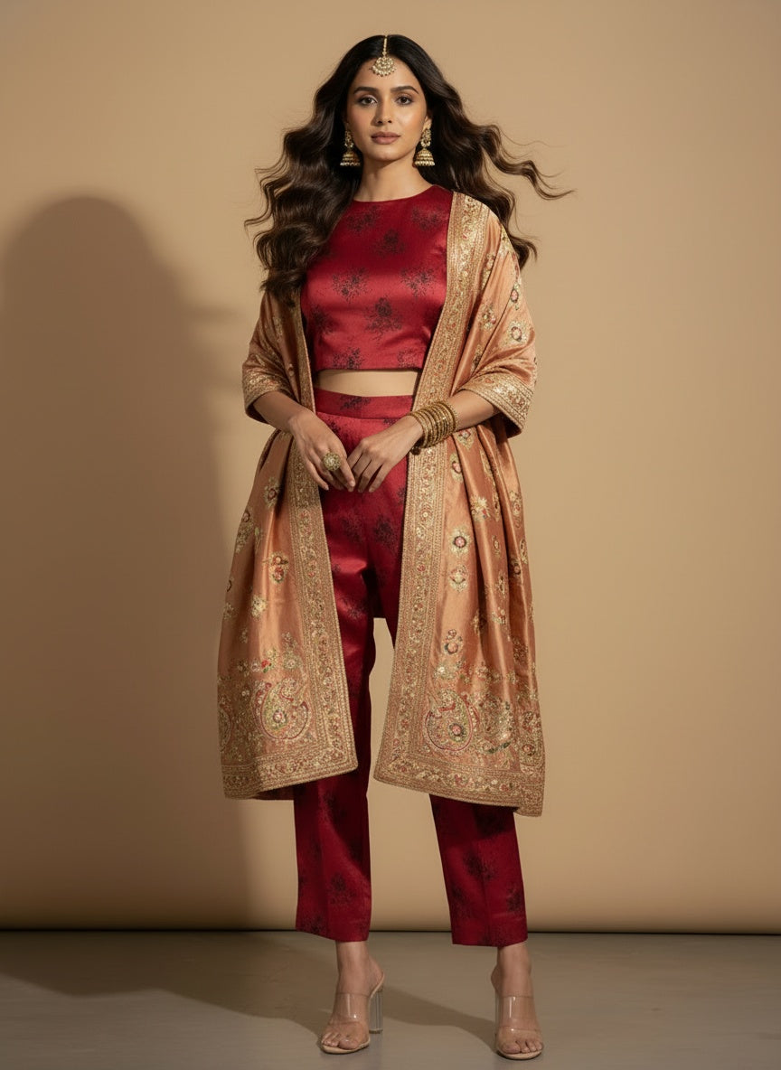 Inayat is a luxe three-piece set in deep maroon printed glaze cotton, featuring a crop top and straight trousers patterned with traditional floral motifs. The look is elevated by a floor-length beige jacket (shrug) adorned with intricate paisley embroidery and scalloped borders, creating a regal yet modern silhouette perfect for sangeet nights, festive dinners, or wedding receptions.