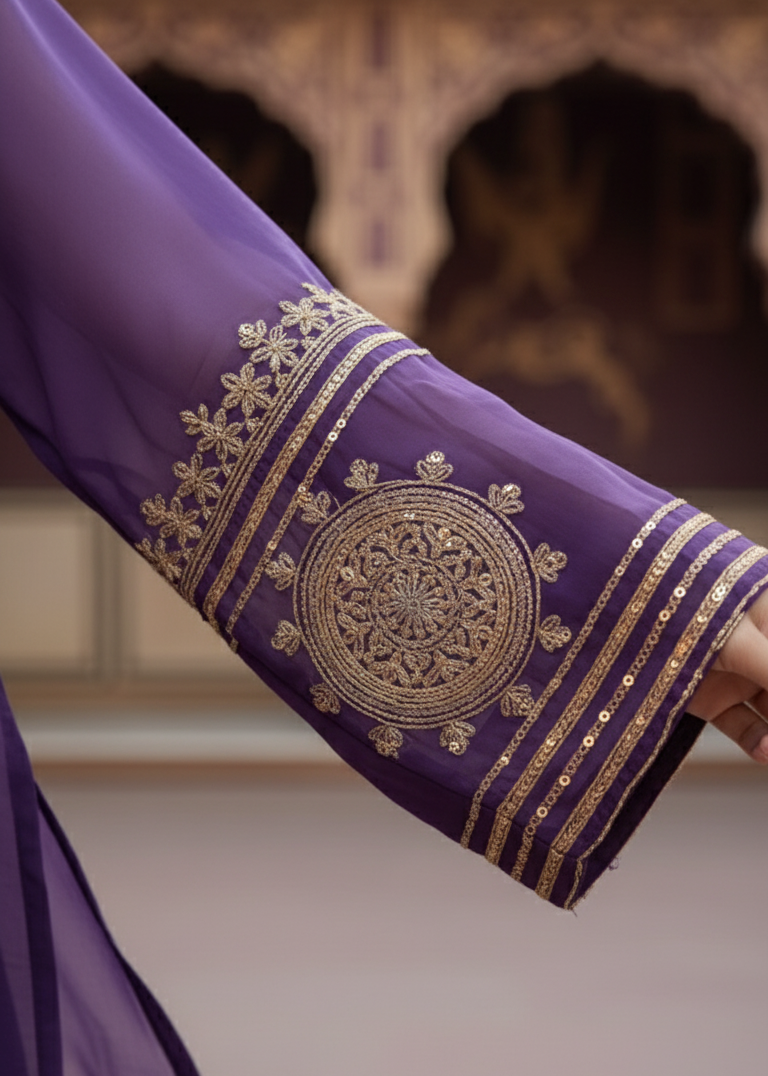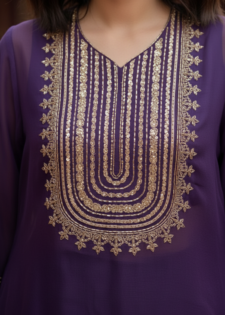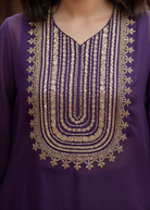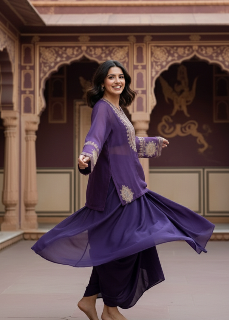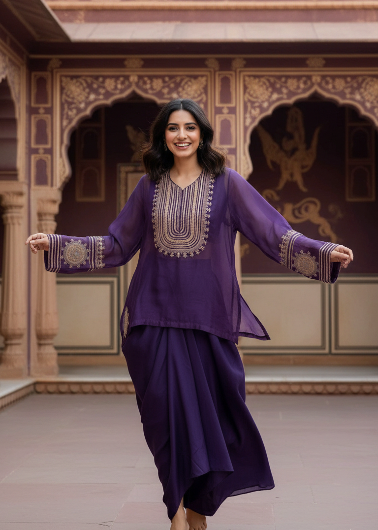 Crafted in royal purple chiffon-georgette, the lightweight kurta features intricate golden embroidery on the neckline and sleeves, perfectly paired with a fluid dhoti bottom for graceful movement.