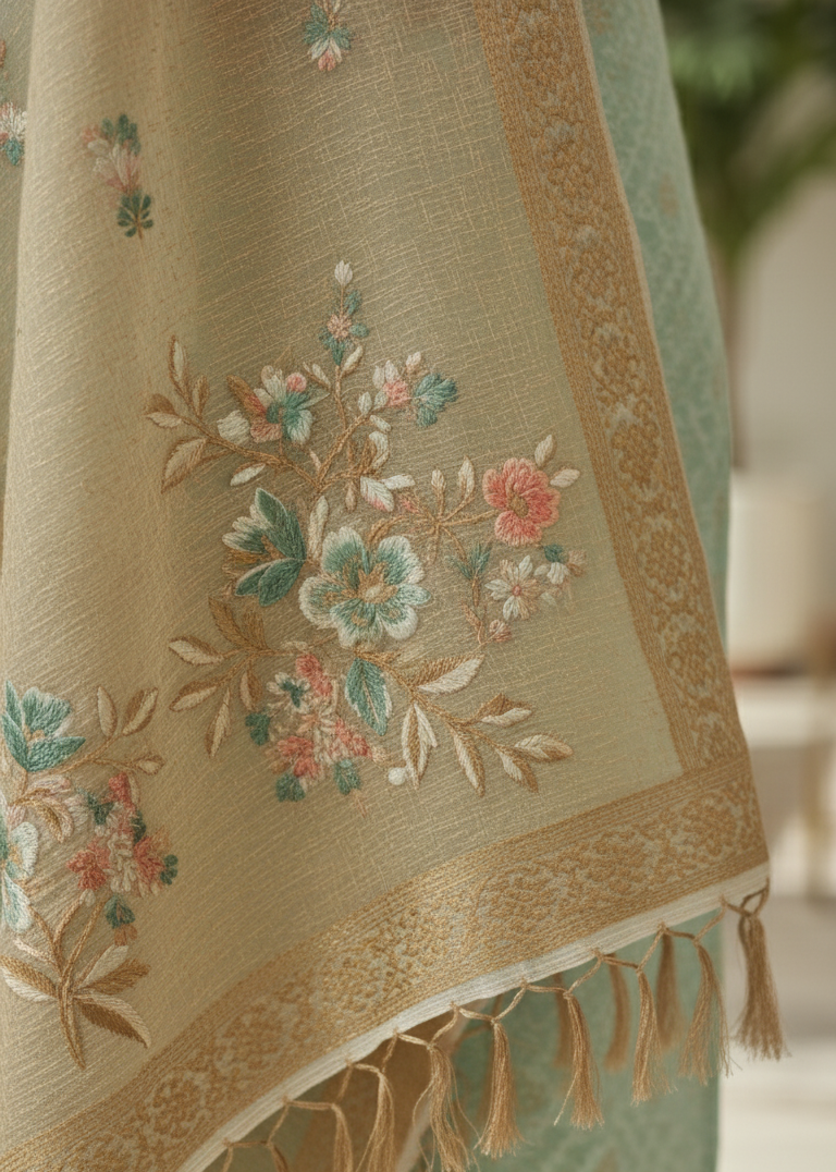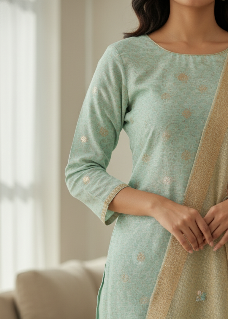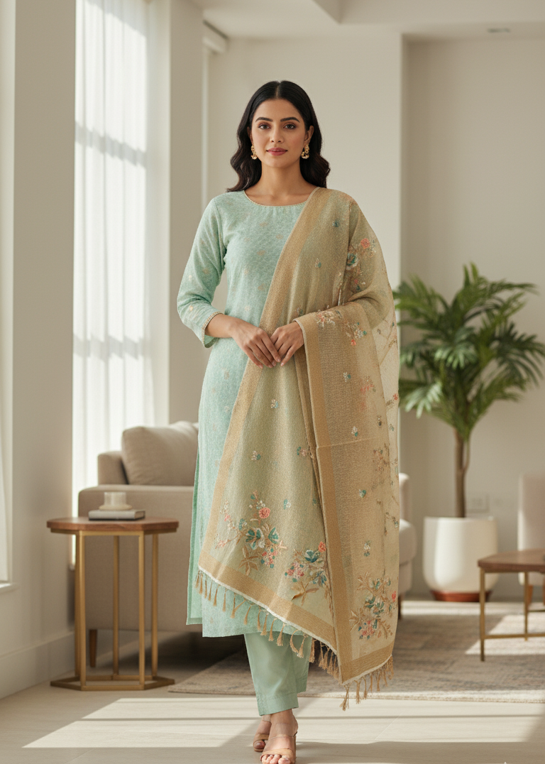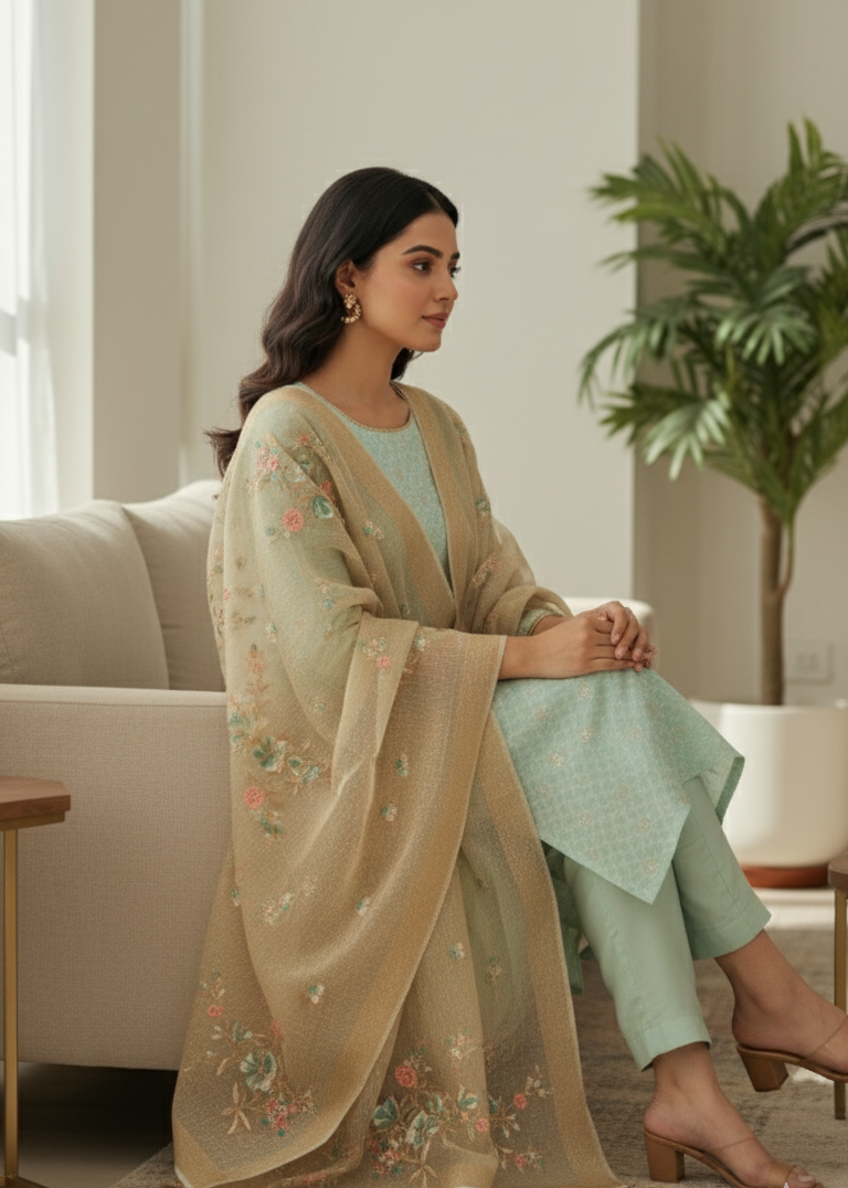 Aabroo brings together soothing pastel hues and delicate floral embroidery in a kurta set crafted for moments of quiet elegance . Its lightweight feel and flowing dupatta echo modern grace, making it perfect for intimate celebrations, cultural gatherings, and easy festive chic