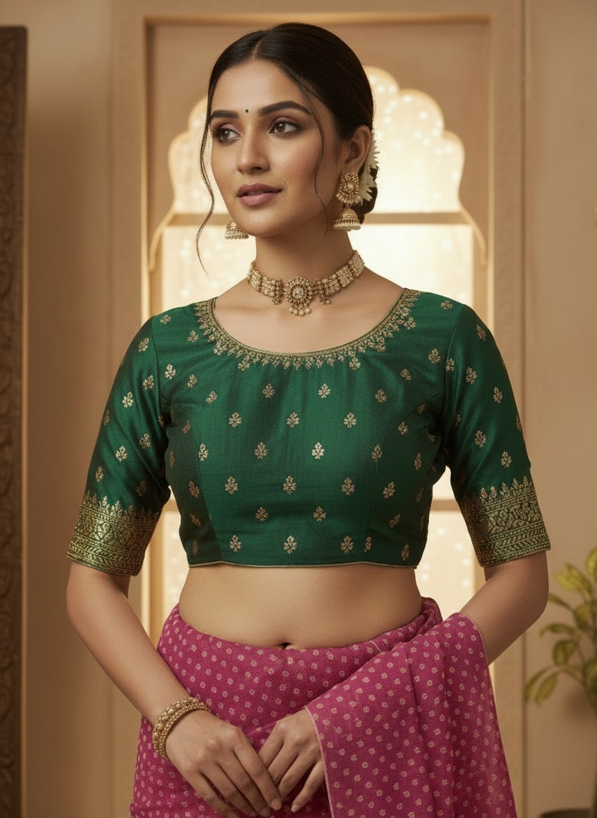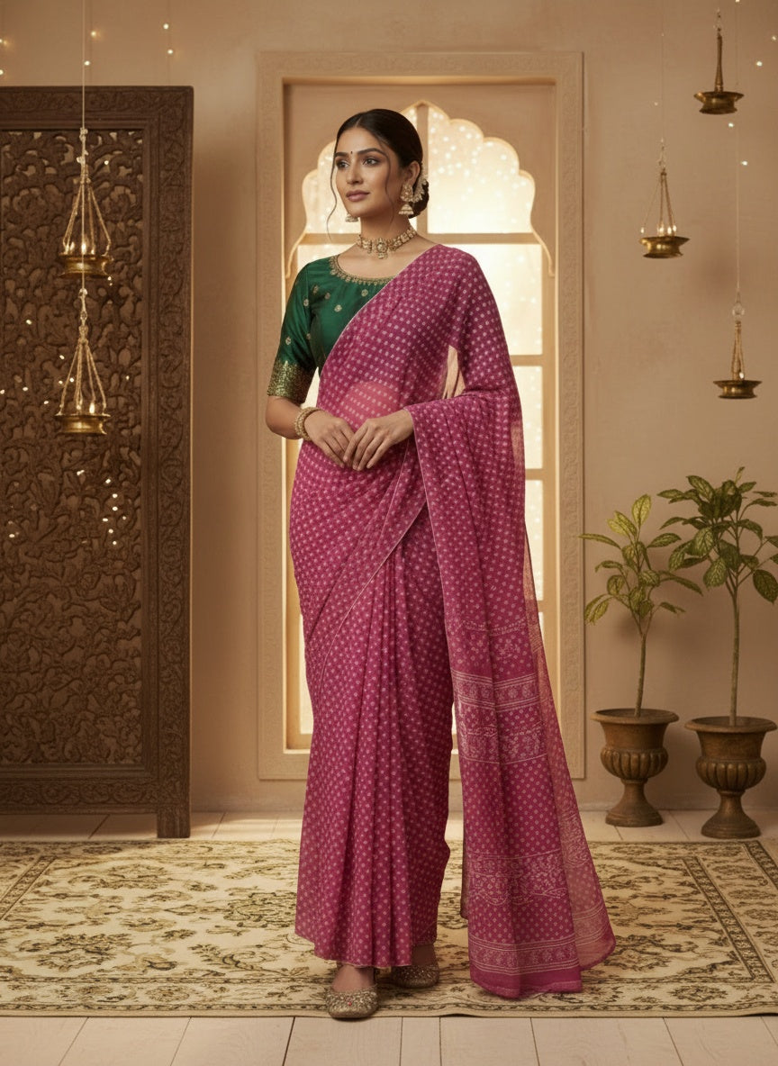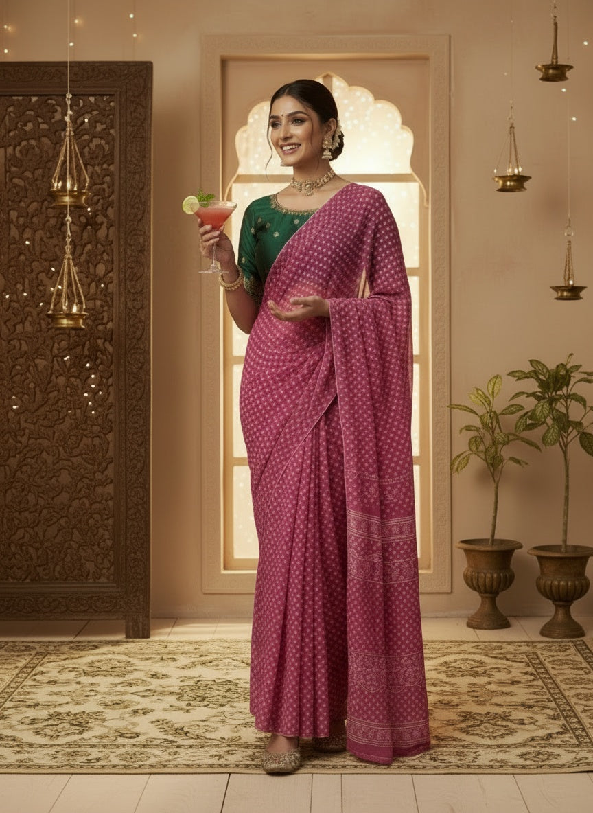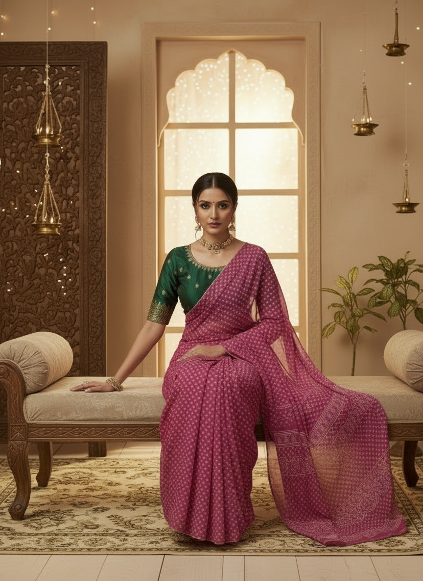 Jivala is a vibrant magenta georgette saree patterned with traditional white bandhani dots and subtle self-patterned details. Lightweight and effortless, it offers a fluid drape that moves beautifully, making it an ideal choice for festive days, mehendi functions, or relaxed wedding gatherings. Pair it with a contrasting blouse or keep it tonal for a timeless, joyful look.