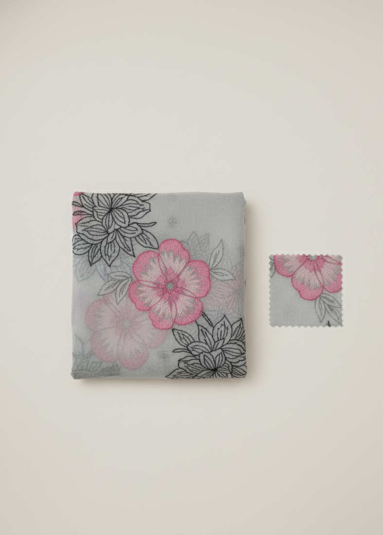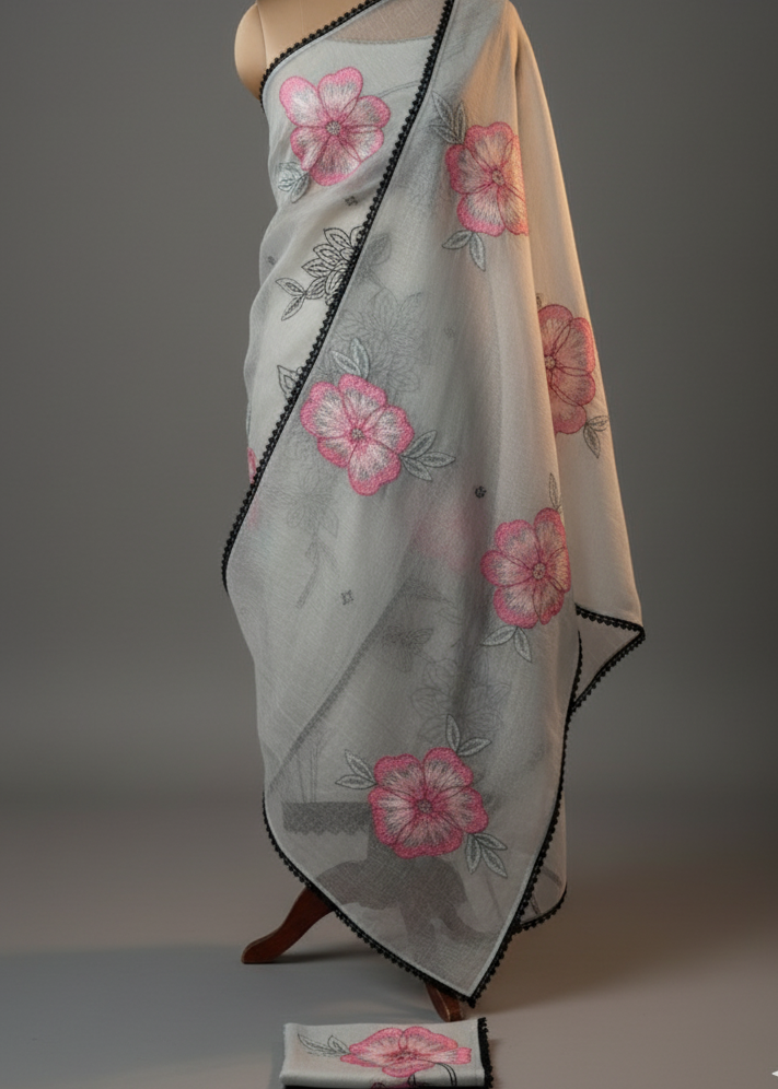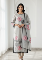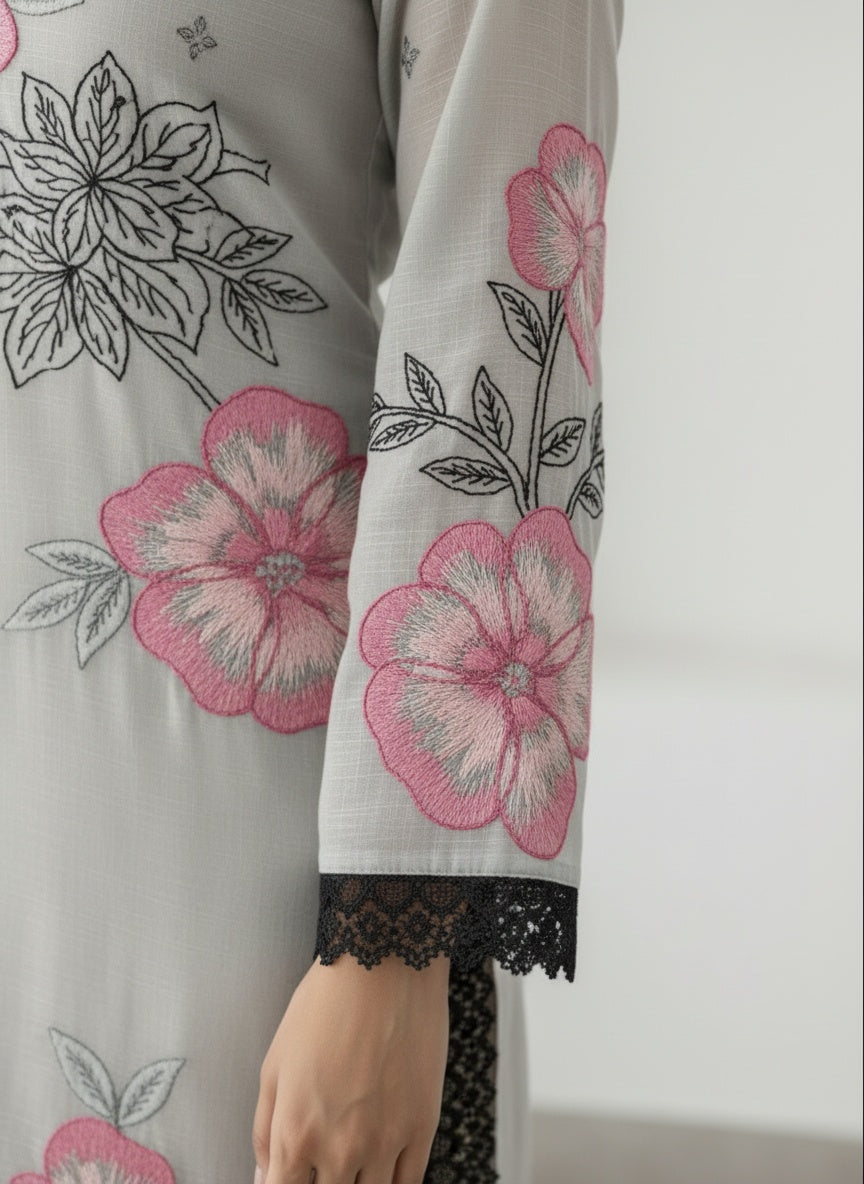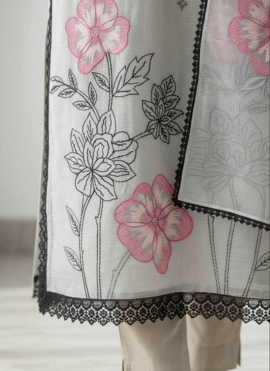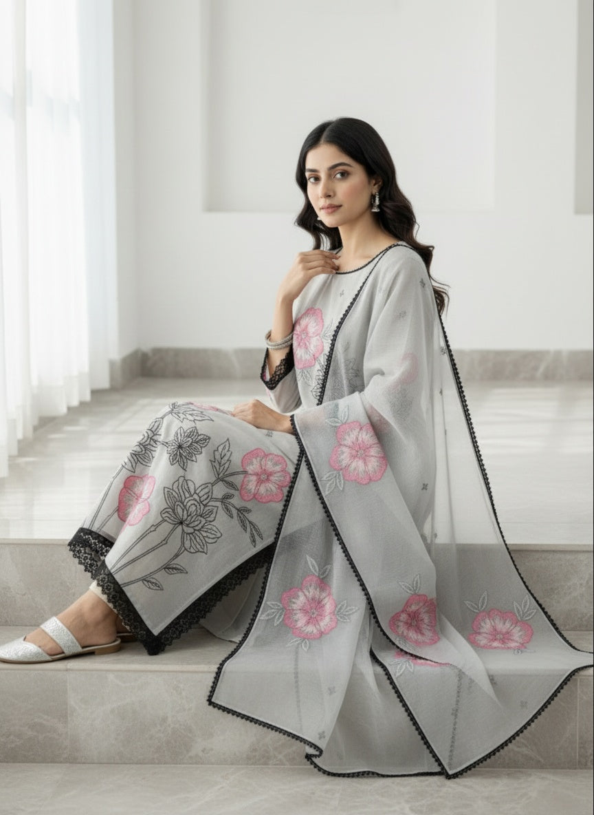 Nazm is an ethereal organza kurta set, shaded in soft grey and adorned with blush, hand‑rendered florals that feel like sketches on translucent paper. Black scalloped lace frames the neckline, sleeves, hem, and dupatta, adding definition to the sheer layers while straight neutral pants keep the silhouette modern, minimal, and occasion‑ready for brunches, mehendi lunches, or intimate celebrations.