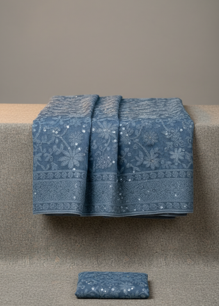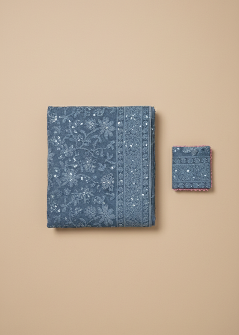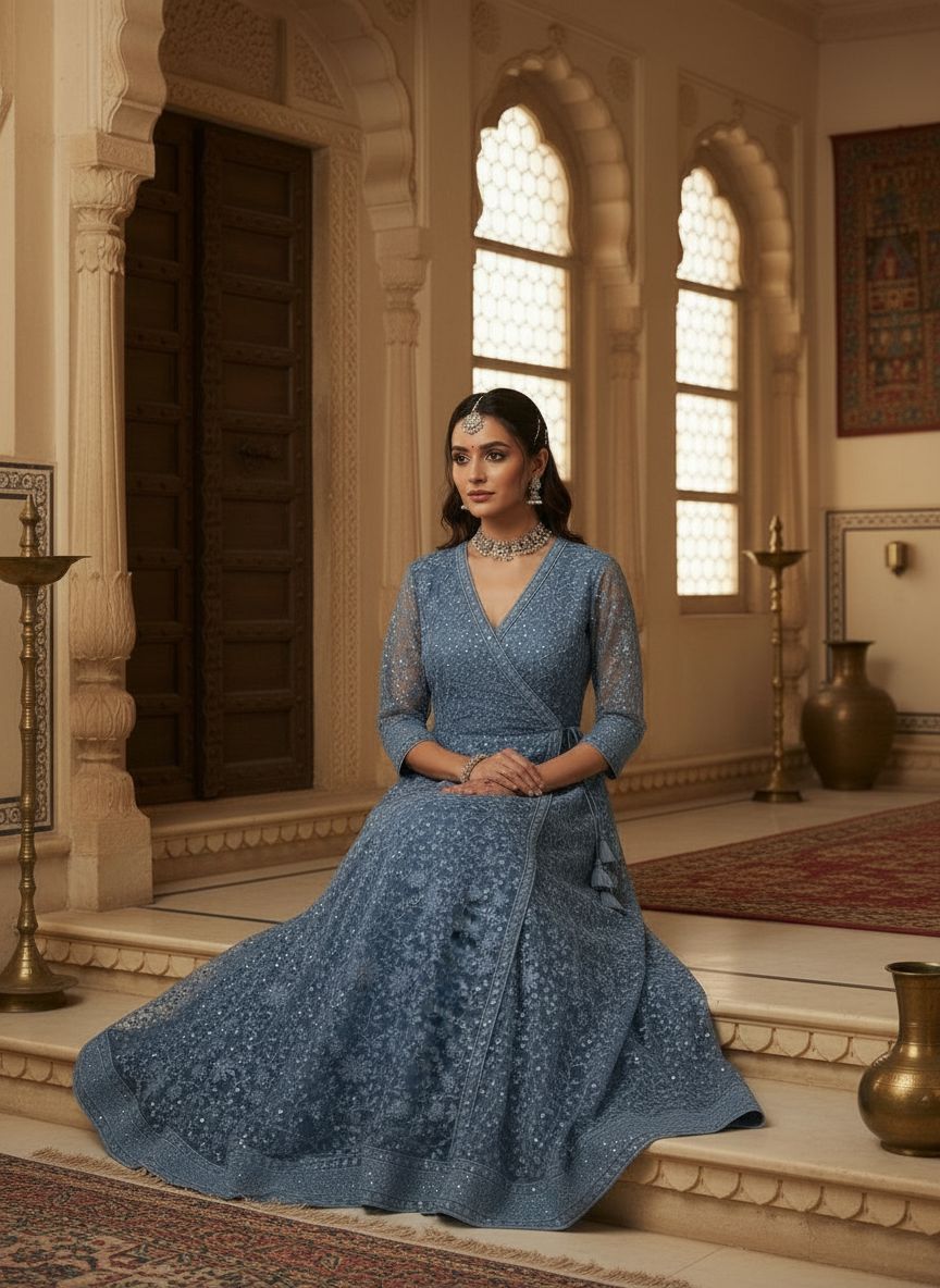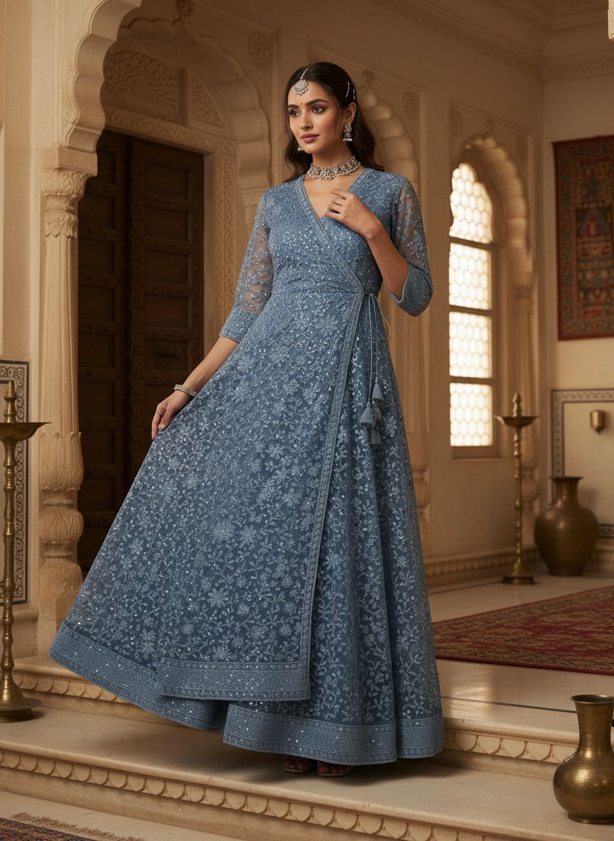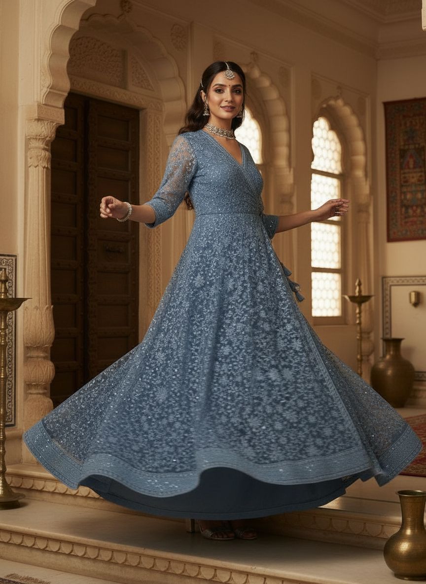Samaa is a sky-toned Lucknowi Chikankari–style georgette Angrakha gown, featuring intricate all-over floral embroidery and subtle shimmer.  The wrap-front silhouette with side tie detail, sheer three-quarter sleeves, and full flared hem create a graceful sweep, ideal for intimate weddings, sangeet evenings, or elevated festive gatherings.