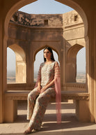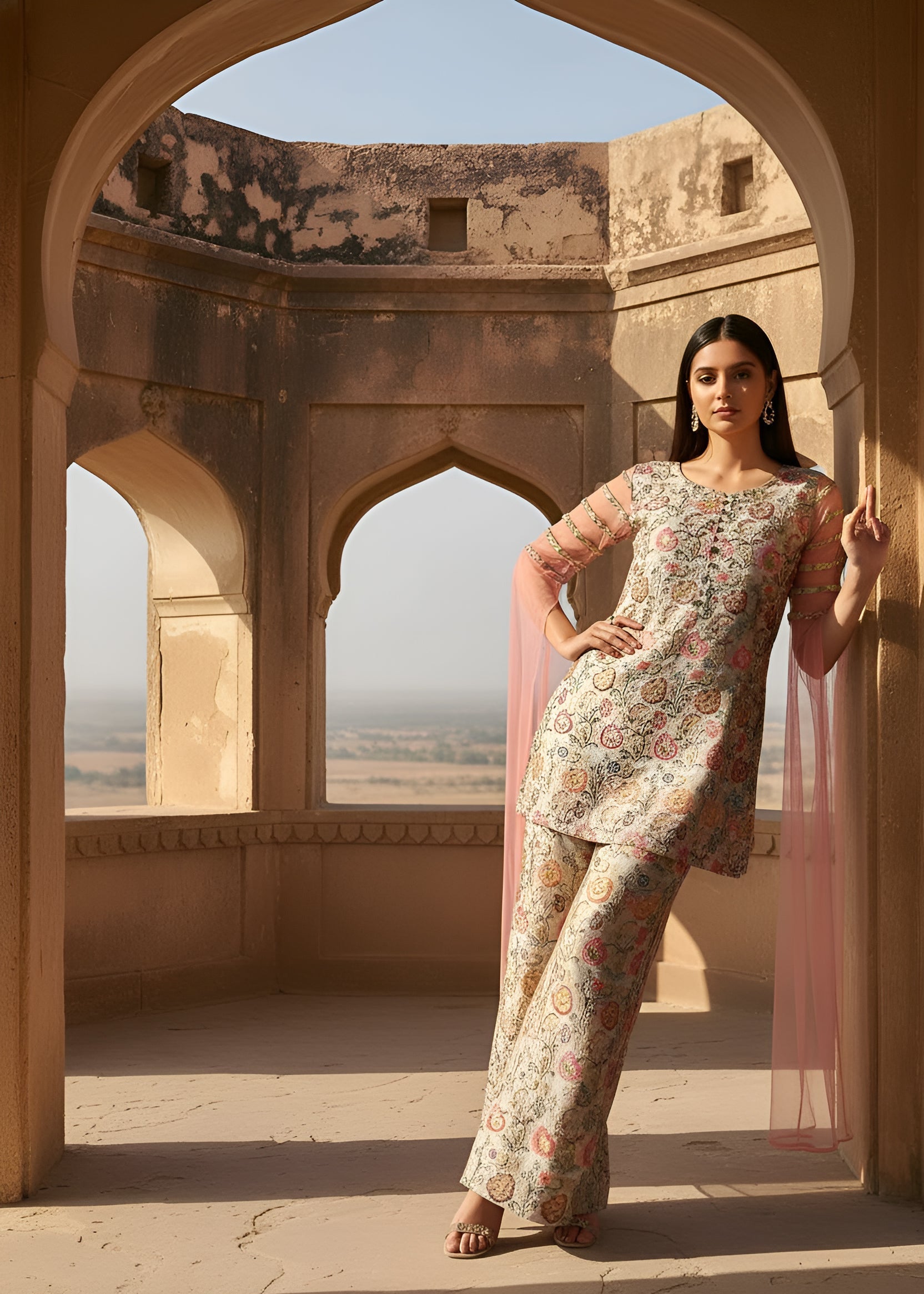 Meher is a bold co-ord set featuring opulent all-over floral embroidery in saturated tones with a tailored fit, paired with sheer accent sleeves for a fusion touch. Versatile, statement-making, and designed for modern urban moments, this set transitions seamlessly from festive gatherings to high-style evenings.