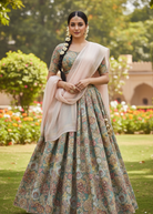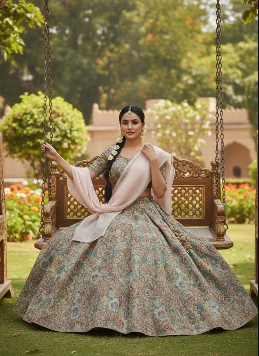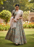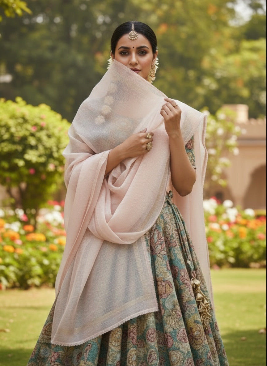 Padmini is a grand yet breathable lehenga set crafted in structured jute fabric, featuring a digital floral print of blooming lotuses in sage green, pink, and rust. The full-volume skirt is paired with a matching printed blouse (or contrasting solid, depending on styling preference) and a soft pink dupatta with a zari border. The unique texture of jute gives the lehenga a crisp, modern drape, making it an ideal choice for day weddings, sangeet ceremonies, or festive celebrations.