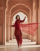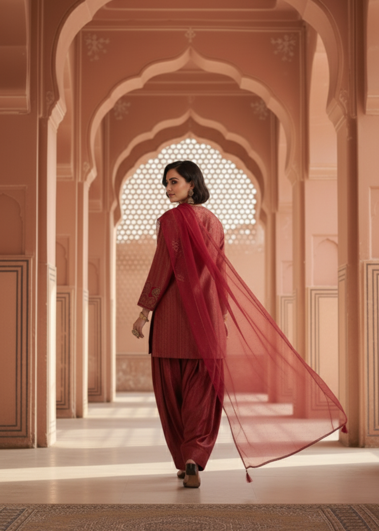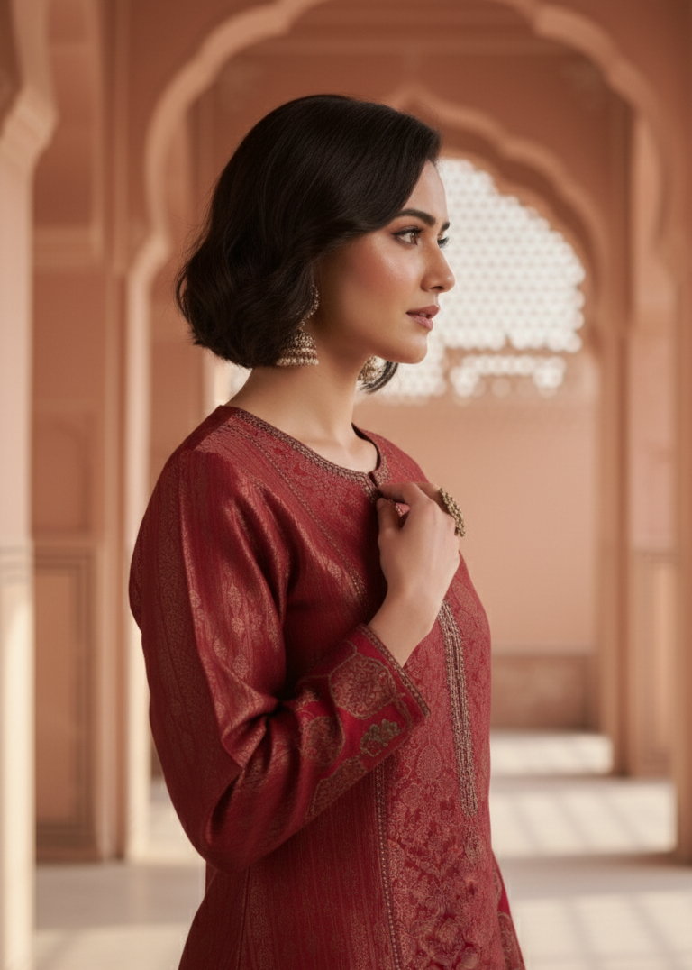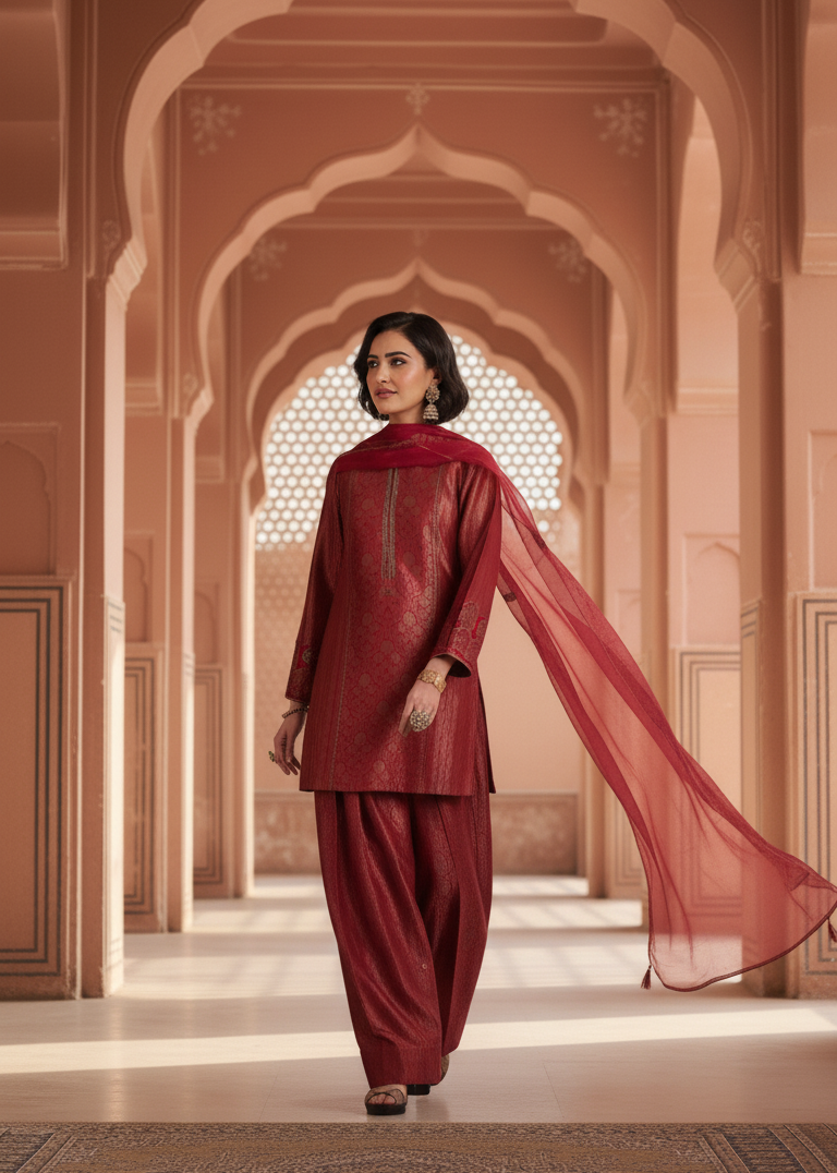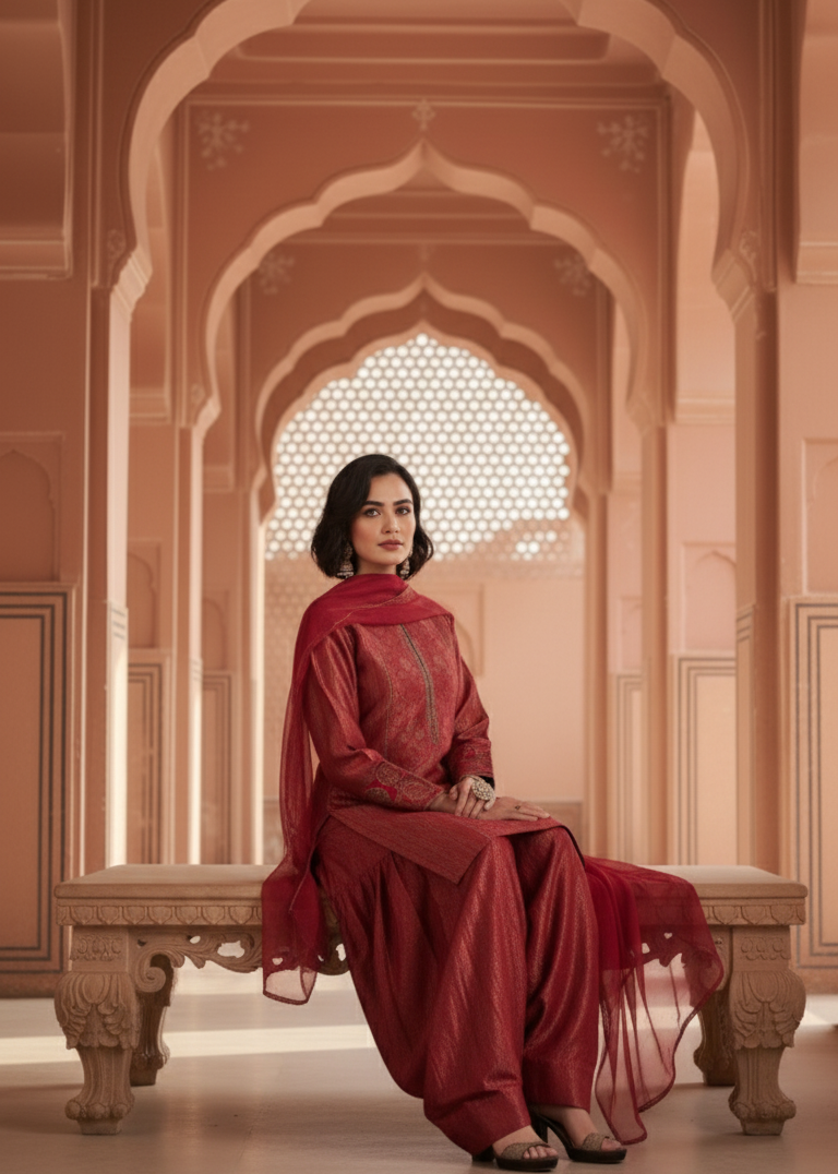 Elevate classic elegance with the Riyaaz – Vermilion Brocade Classic Salwar Set, crafted from heritage-inspired silk brocade in a rich red hue. The tailored kurta features subtle metallic threadwork, paired with billowing traditional salwar pants and a sheer organza dupatta for an airy finish. Perfect for weddings, festive luncheons, or cultural gatherings, this timeless ensemble combines authentic craftsmanship and sophisticated comfort for lasting impressions.