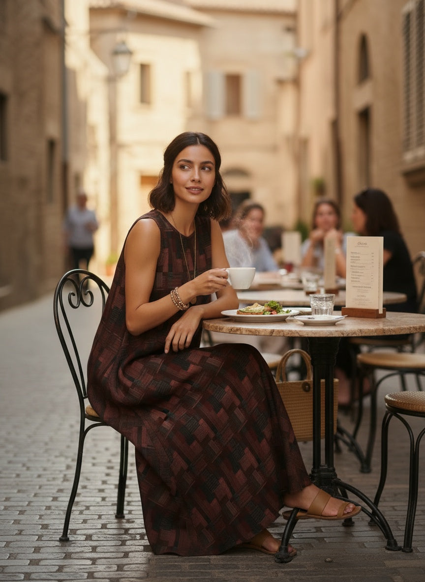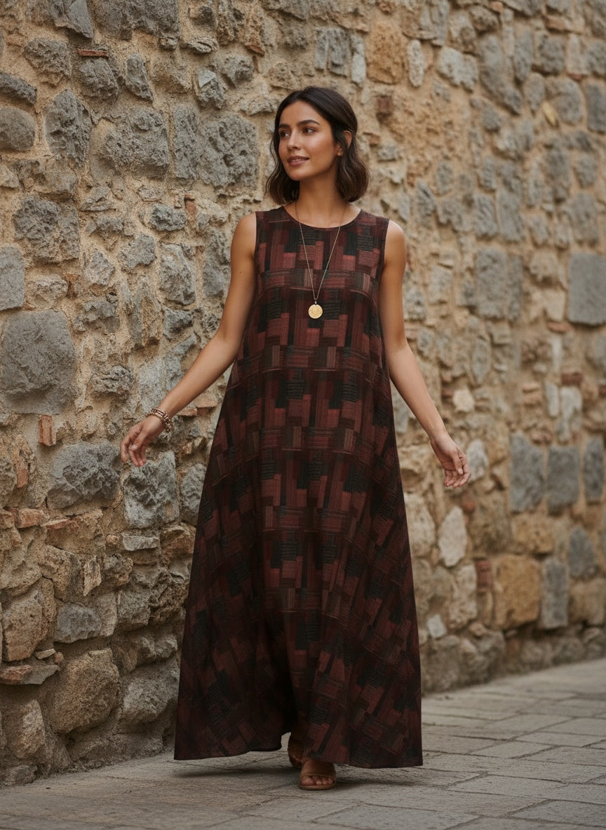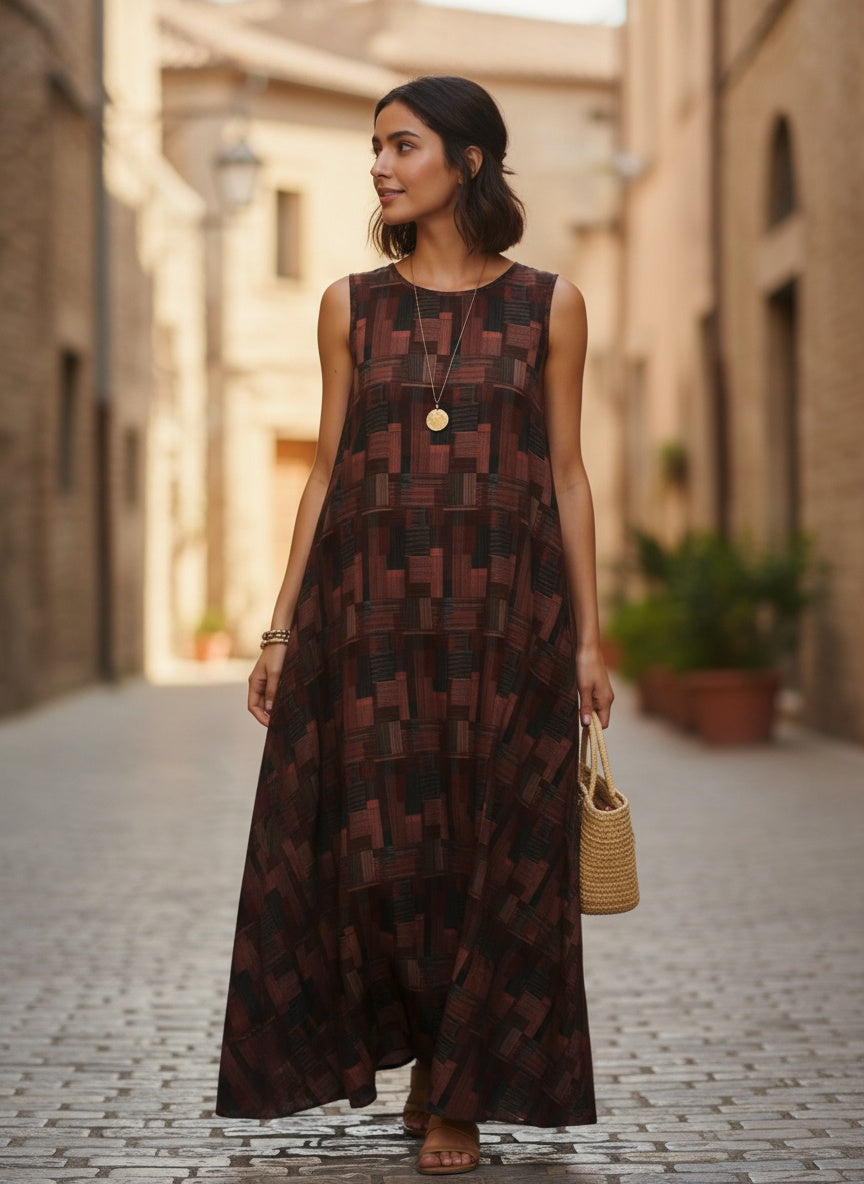 Bhoomi is a relaxed, sleeveless maxi dress crafted in soft, breathable cotton featuring an earthy geometric block print in brick red, charcoal, and cocoa tones. Cut for effortless movement with a gentle A-line flare, it’s the ultimate vacation or weekend staple—style it with a straw tote and slides for a laid-back, bohemian look.