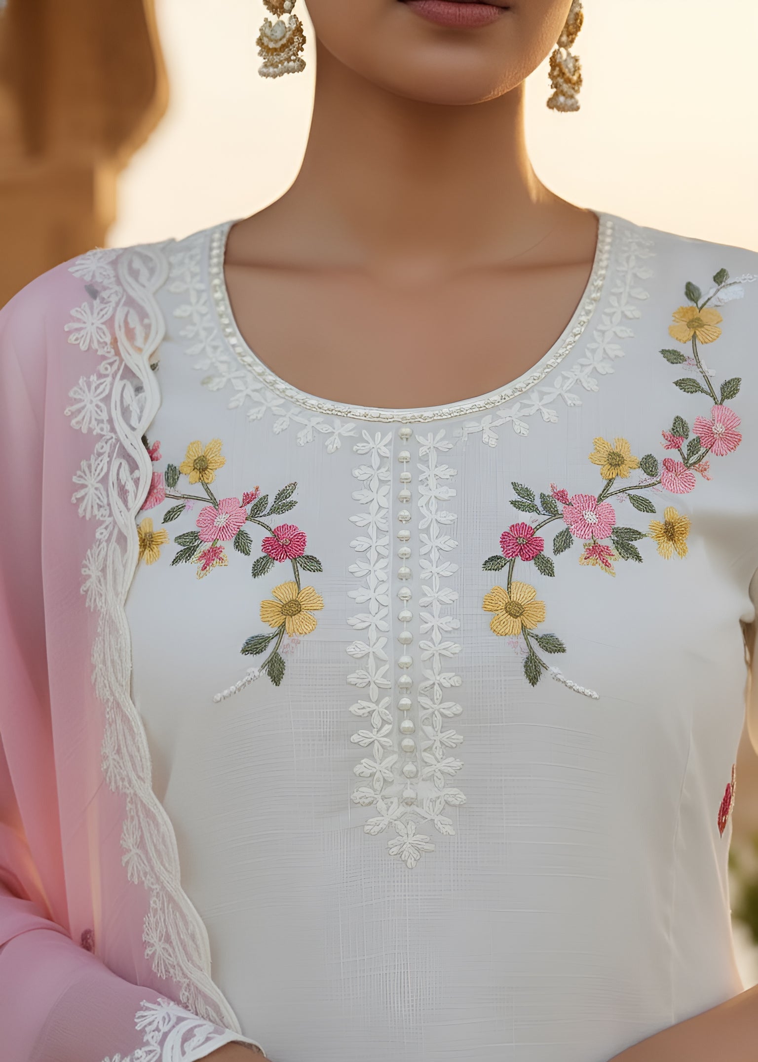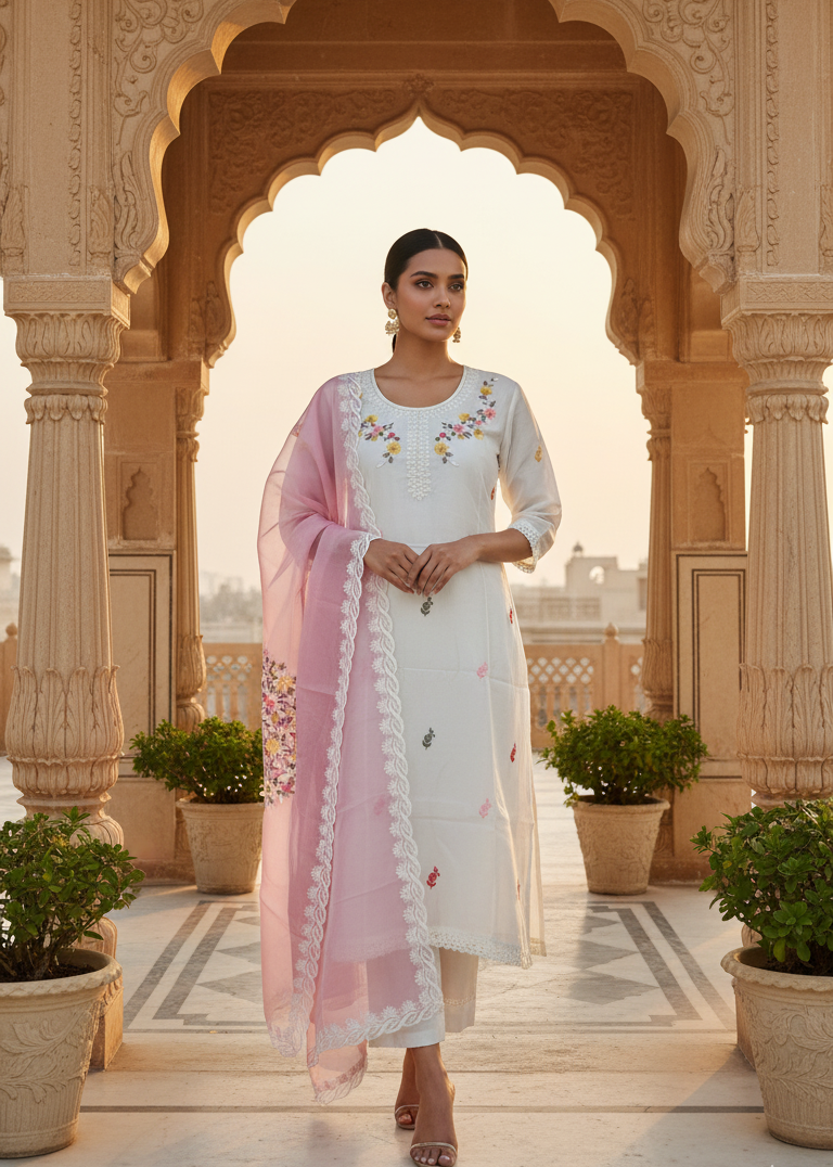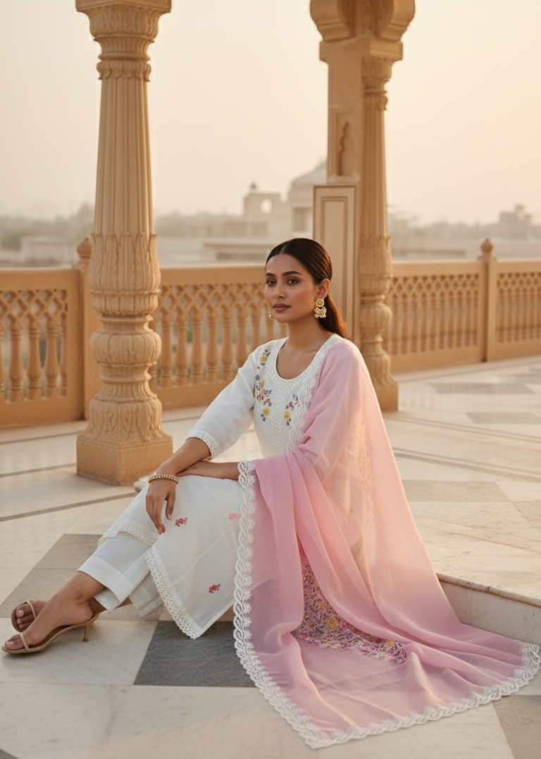 A luminous kurta set finished in pure white, styled with a delicate pink dupatta and soft floral accents, radiating elegance under a warm sunset terrace. The airy silhouette and refined detailing create a timeless, gentle look ideal for outdoor gatherings, festive moments, and everyday celebrations