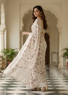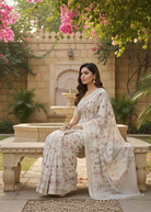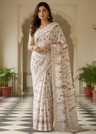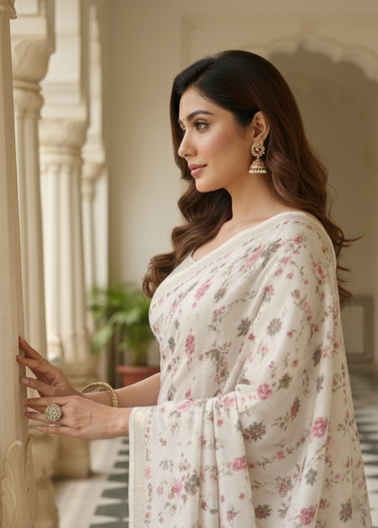 An ethereal saree in soft ivory accented with understated floral motifs, styled in a regal corridor setting that enhances its light, romantic presence . The fluid drape and refined detailing create a timeless look that transitions effortlessly from daytime celebrations to evening soirées while photographing beautifully amid architectural backdrops